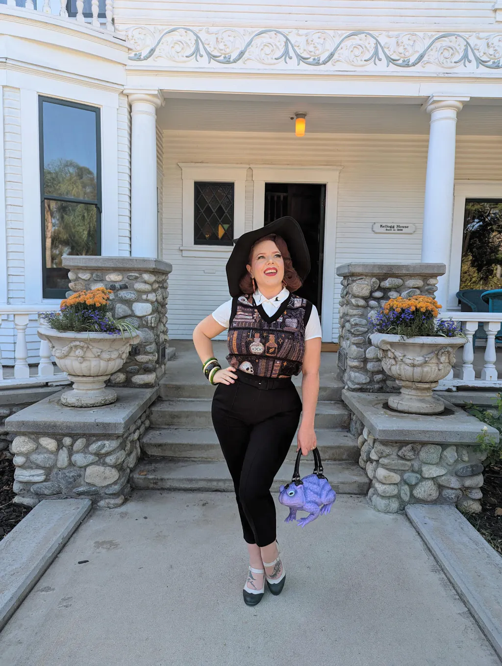 This cozy v-neck knit sweater vest features a one-of-a-kind design by yours truly, Frankie Print Co, blending unique style with everyday comfort. It's a relaxed-fit sweater that's soft, lightweight, and perfect for any season. Featuring a witch's bookshelf theme with books, potions, herbs, a sleeping cat, and skulls, it’s a magical piece for any wardrobe.