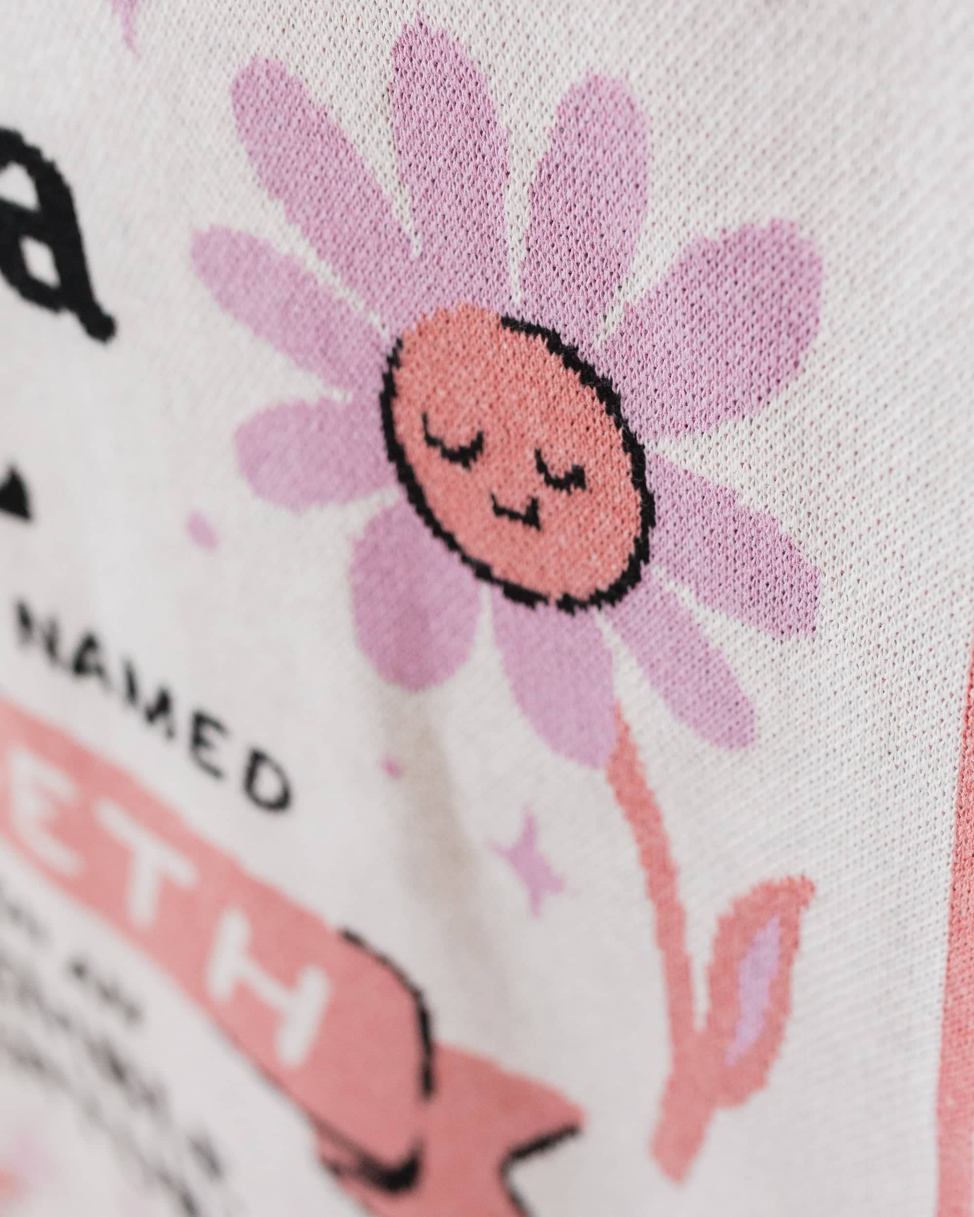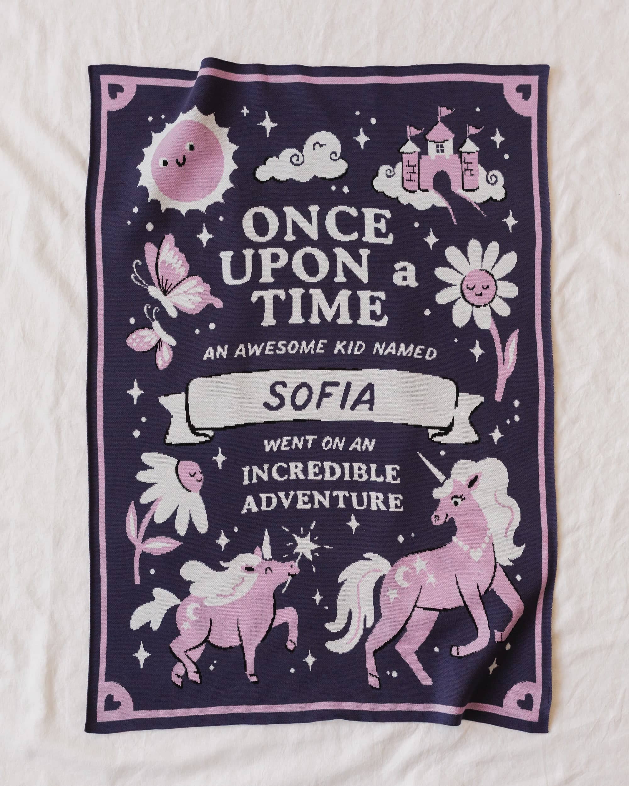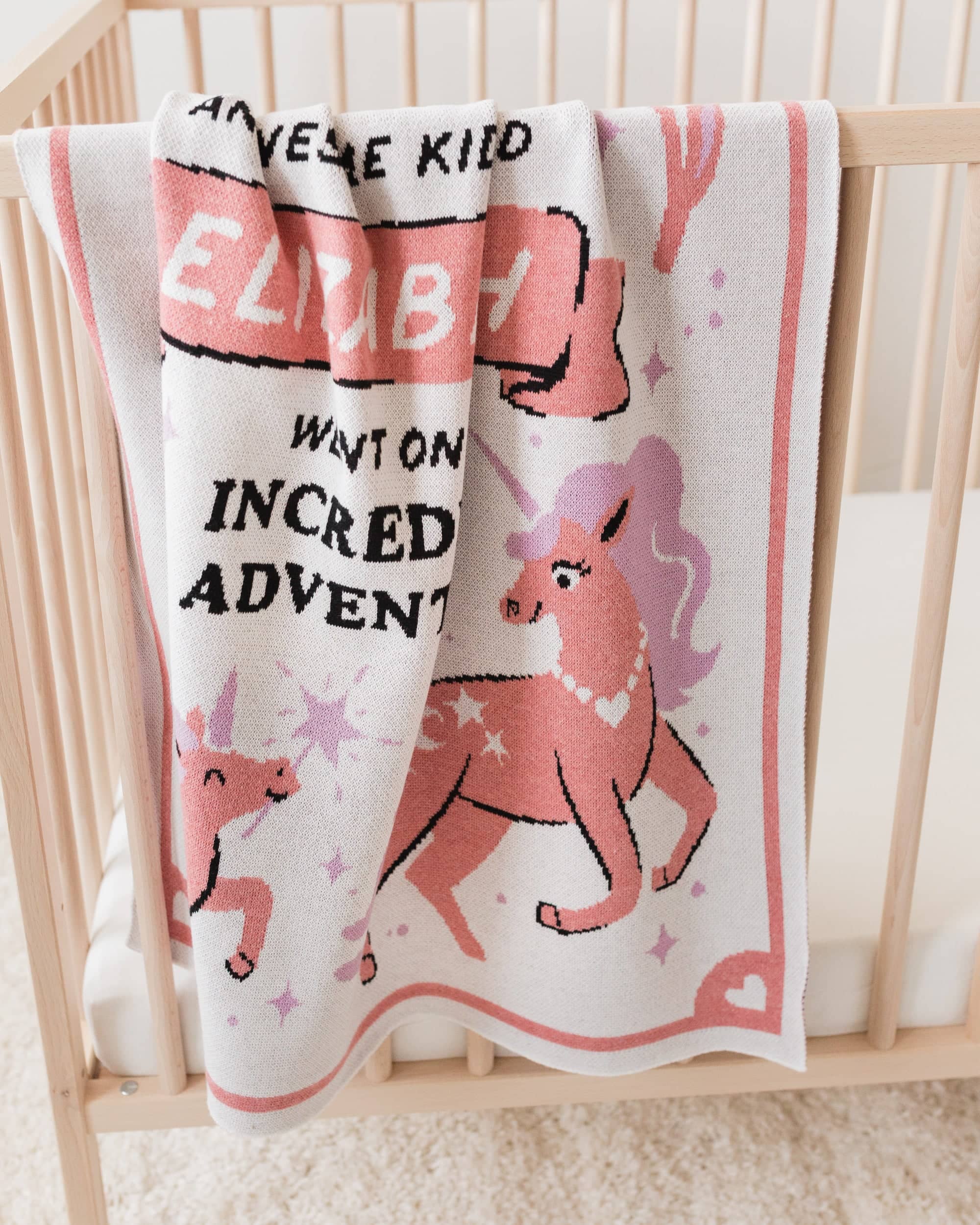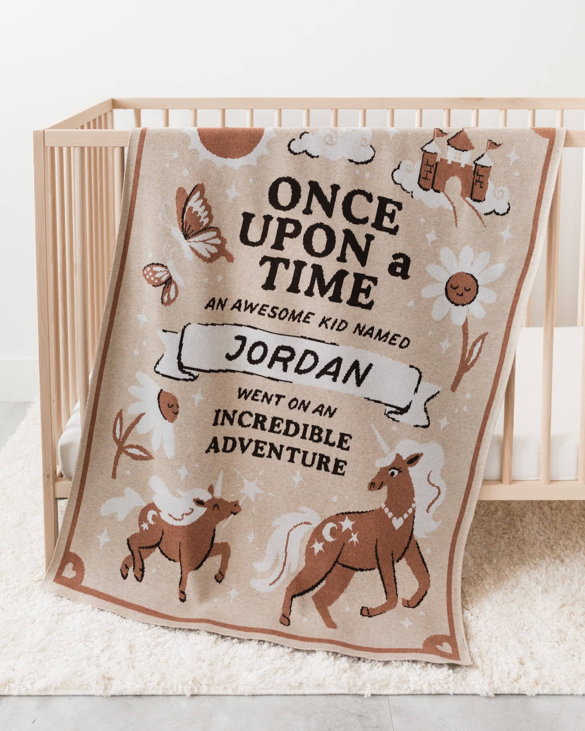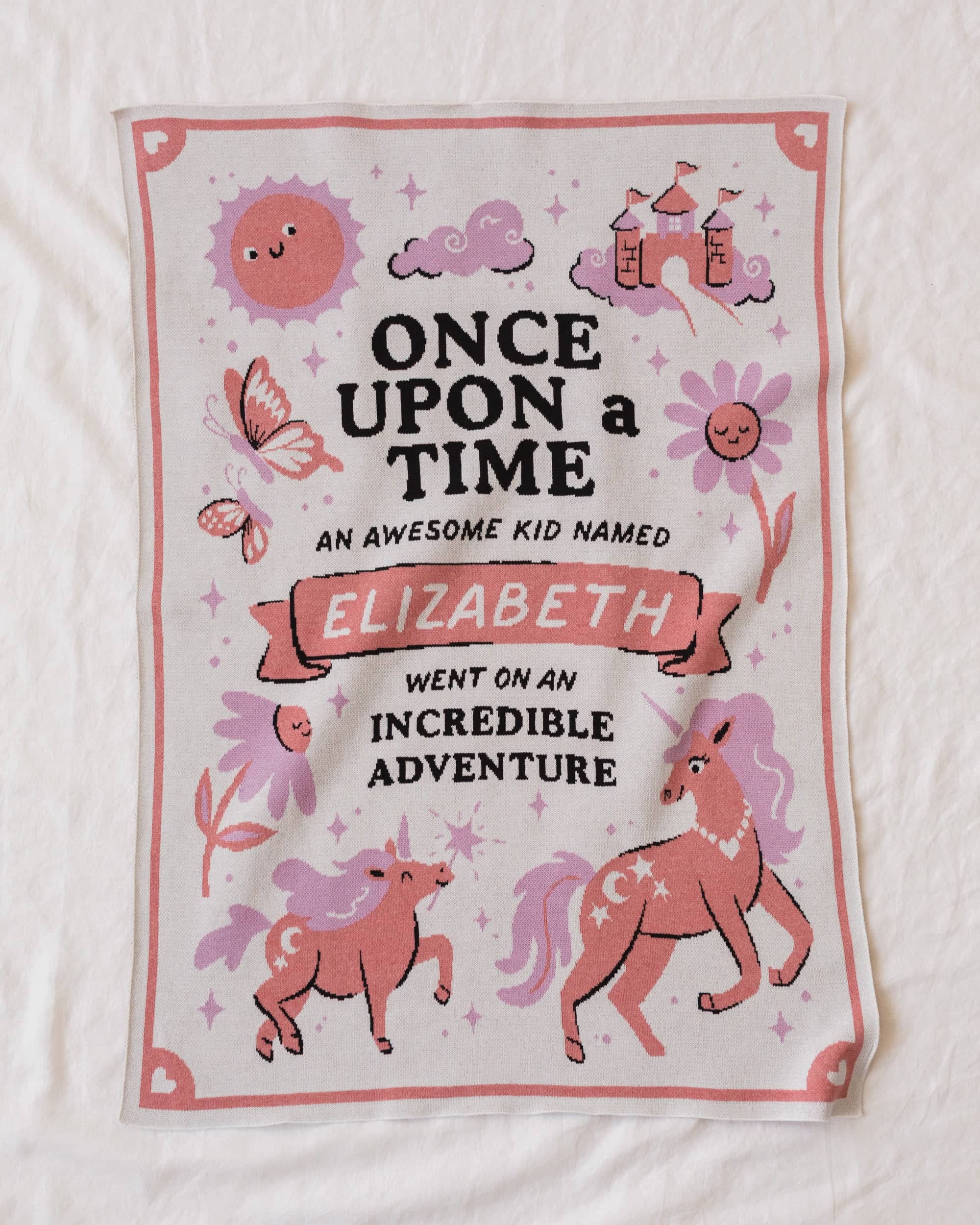 A storybook-style knit blanket that feels like the first page of their very own adventure. Featuring whimsical unicorn and castle illustrations, it’s personalized with your child’s name right in the center — made to feel special.